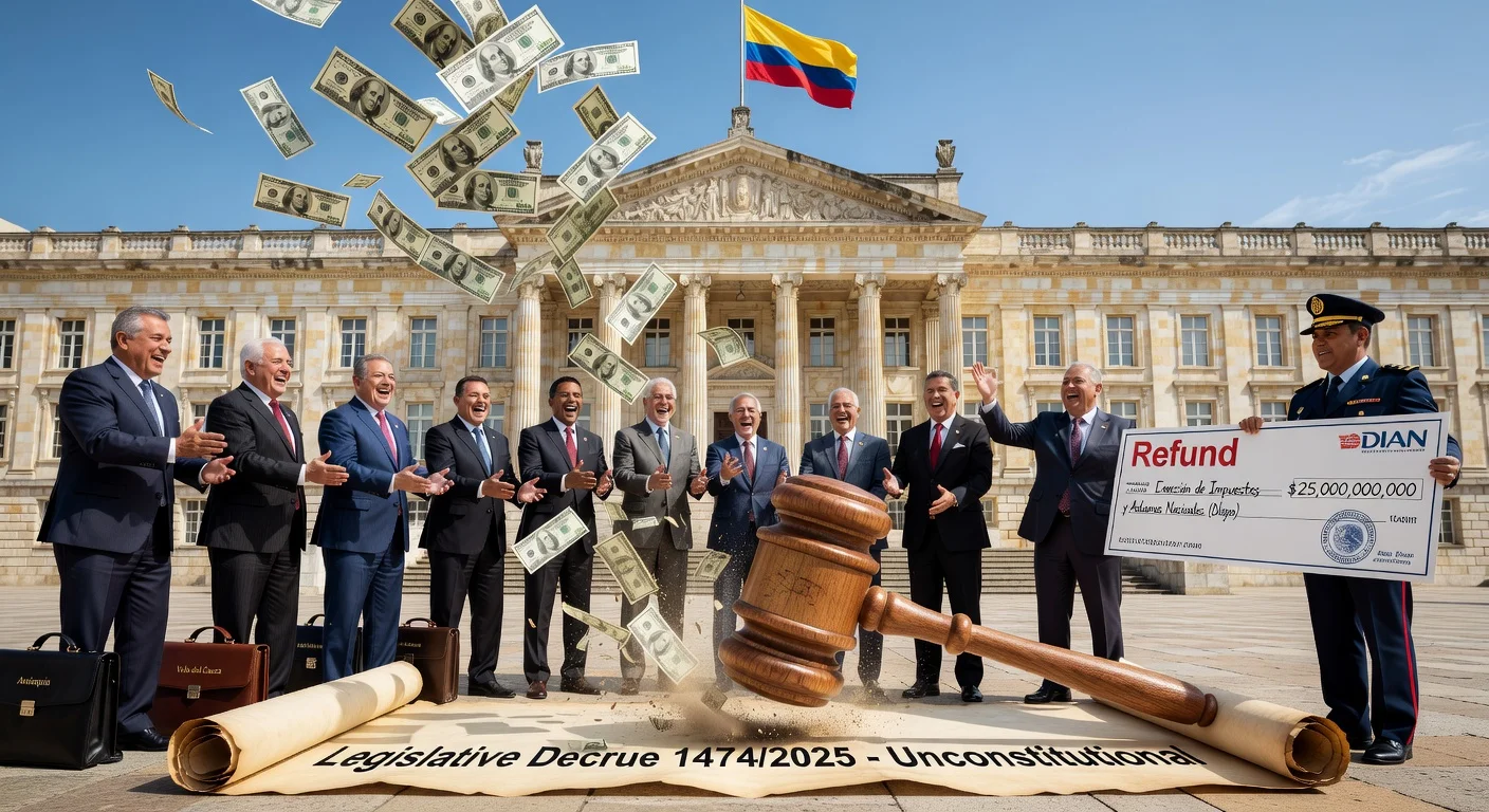 Colombia's Constitutional Court declared Legislative Decree 1474 of 2025 unconstitutional and ordered the Dian to return about $25 billion collected from emergency economic taxes in December. The Dian confirmed it will comply and implement measures within 30 days. Governors welcomed the ruling for easing regional finances.