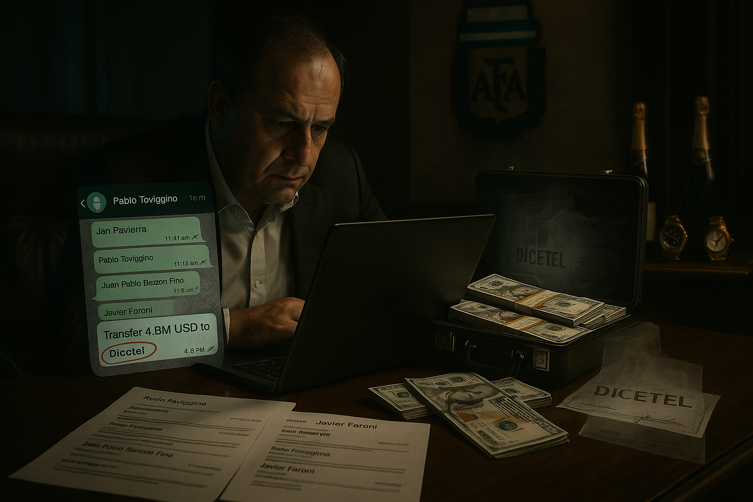 The Argentine Football Association (AFA) is embroiled in a corruption scandal involving obscene expenses, ghost companies, and million-dollar fund diversions. Leaked chats show Juan Pablo Beacon, a close associate of AFA treasurer Pablo Toviggino, directing the transfer of US$4.8 million to Dicetel, identified as a ghost company. The operation also involves a financier nicknamed “Fiño” and Javier Faroni's firm, alongside figures like Claudio Tapia.