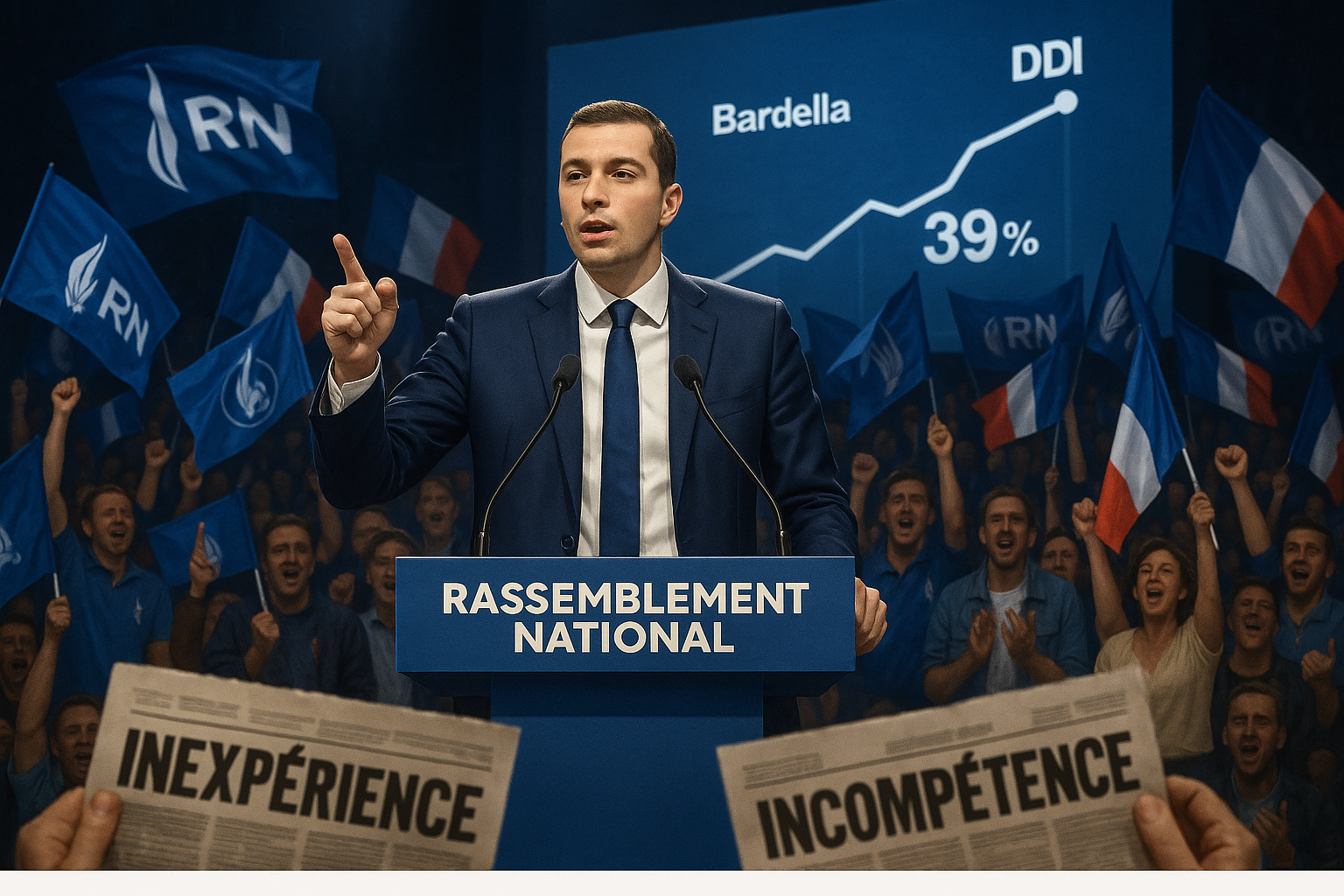 Jordan Bardella addressing RN supporters at a rally, with JDD poll highlighting his popularity despite criticism of inexperience.