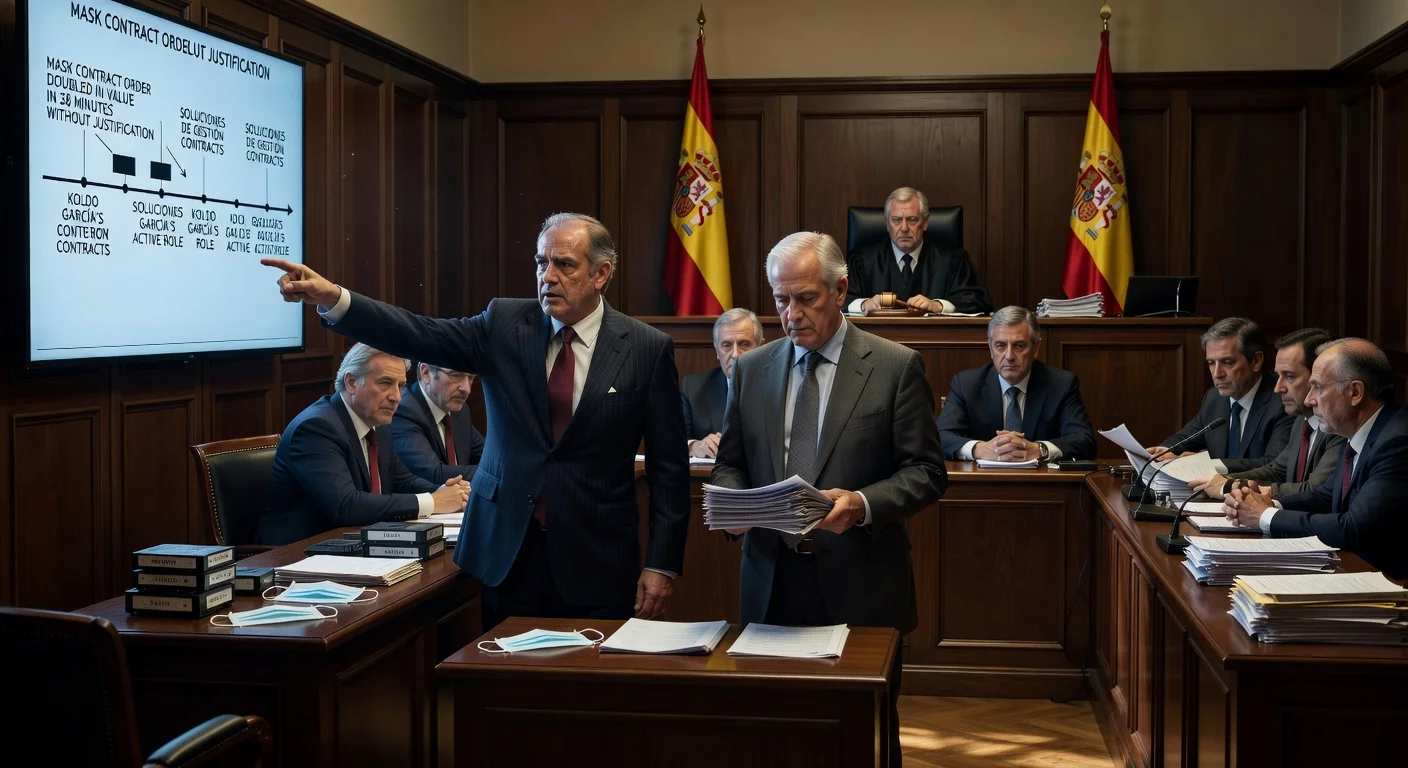Dramatic courtroom clash between experts over irregular mask contracts in Ábalos trial, featuring audit graphs and defendants.