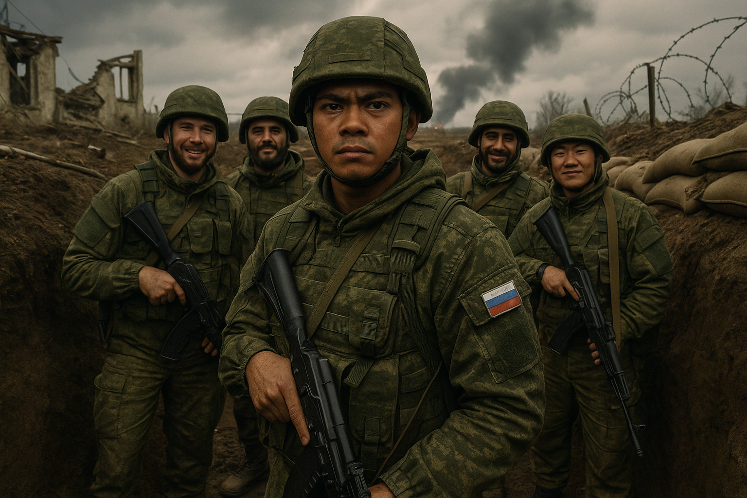 Dramatic illustration of Indonesian Brimob deserter Bripda Muhammad Rio posing as a Russian mercenary on a battlefield.
