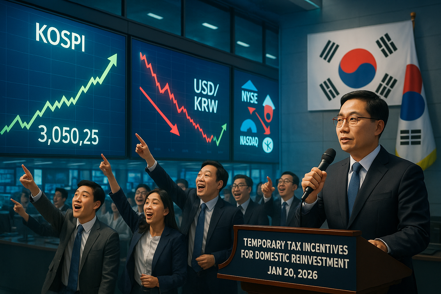 The South Korean government announced on January 20, 2026, temporary tax incentives for retail investors selling overseas stocks this year and reinvesting in domestic assets. The measure aims to address capital outflows by domestic investors that have contributed to the depreciation of the Korean won against the U.S. dollar.
