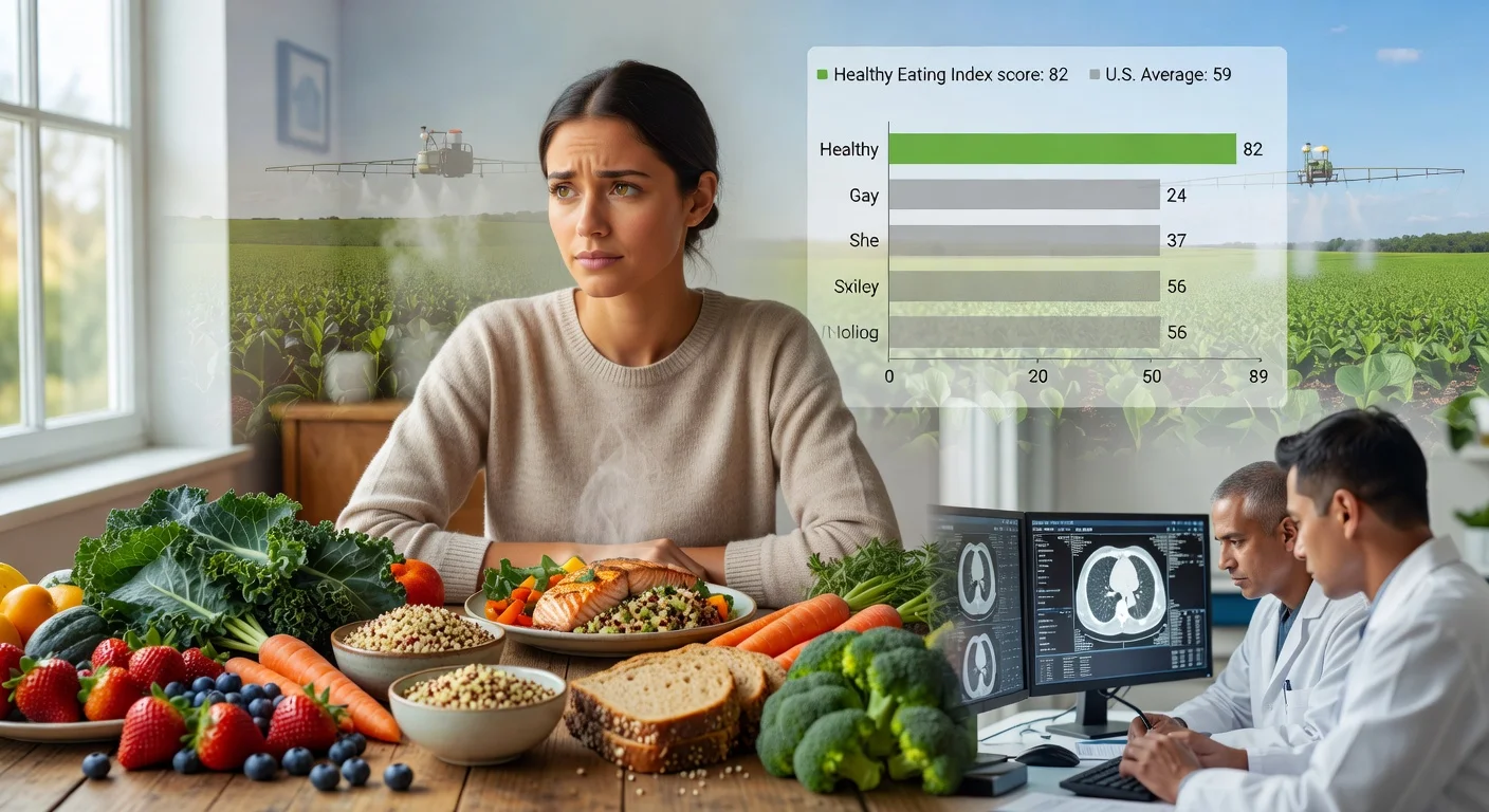 Illustration of young non-smoking lung cancer patient enjoying high-quality healthy diet of fruits, vegetables, and whole grains, with charts showing above-average scores and subtle pesticide exposure hints.