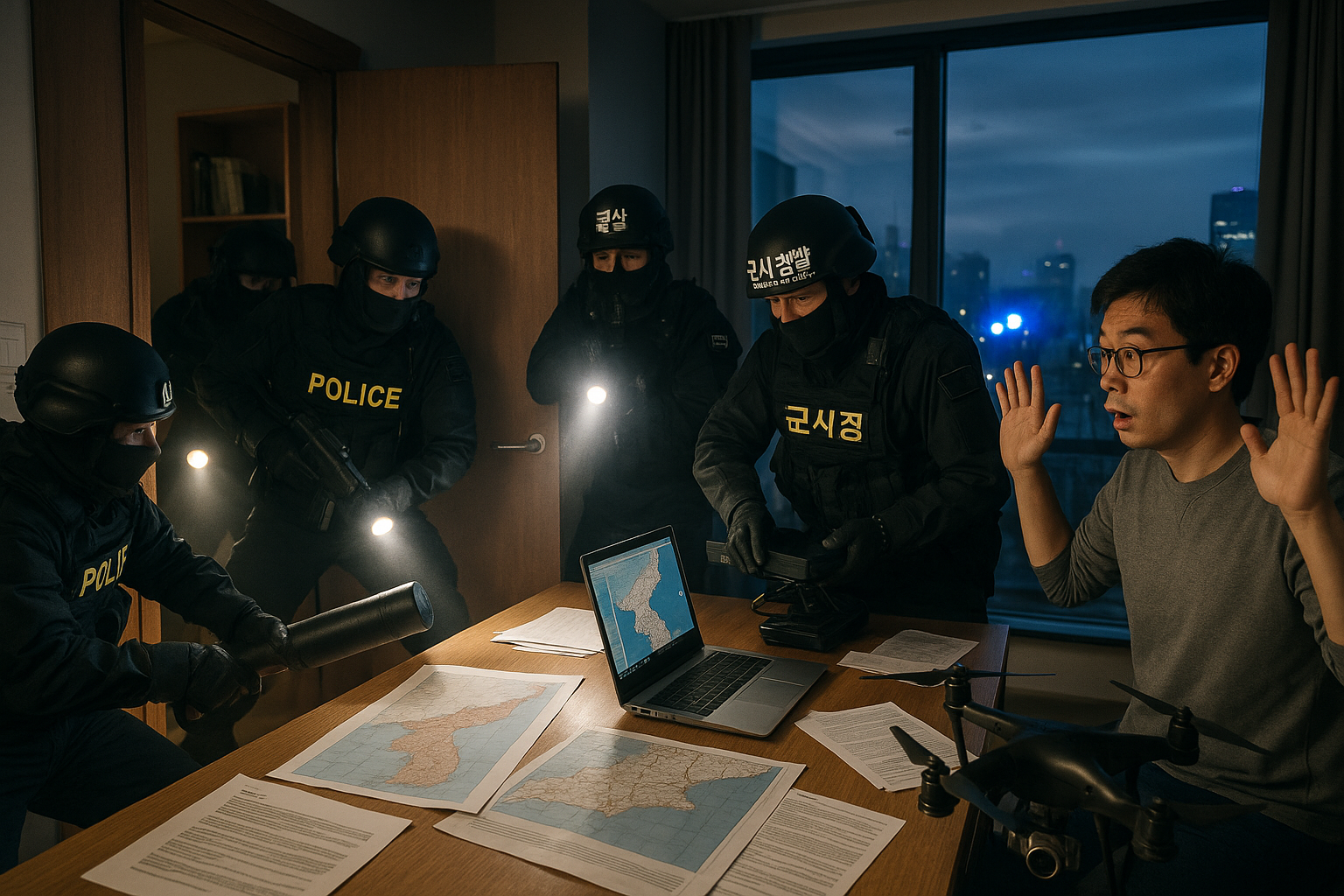 South Korean police and military investigators raided the homes and offices of three civilian suspects accused of drone flights into North Korea, escalating the probe sparked by a graduate student's public claim last week. The action targets individuals linked to sovereignty violation claims by Pyongyang in late 2025 and early 2026.