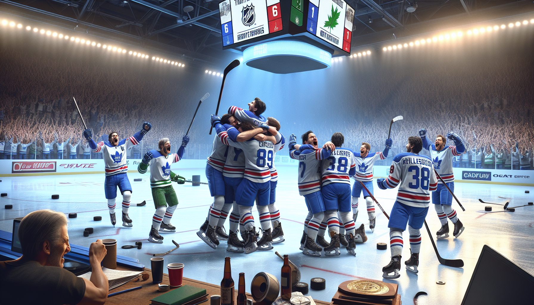 HV71 players emotionally celebrating a 6-1 win over Djurgården, dedicating it to their GM on sick leave, with scoreboard and action elements.