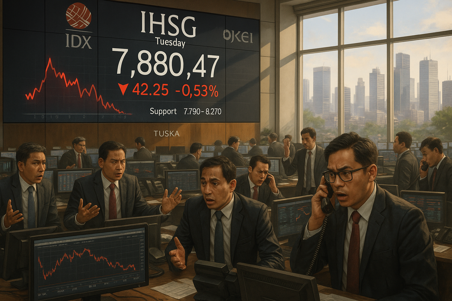 Realistic depiction of IHSG index weakening at the Indonesia Stock Exchange morning open, with traders monitoring the decline on screens.
