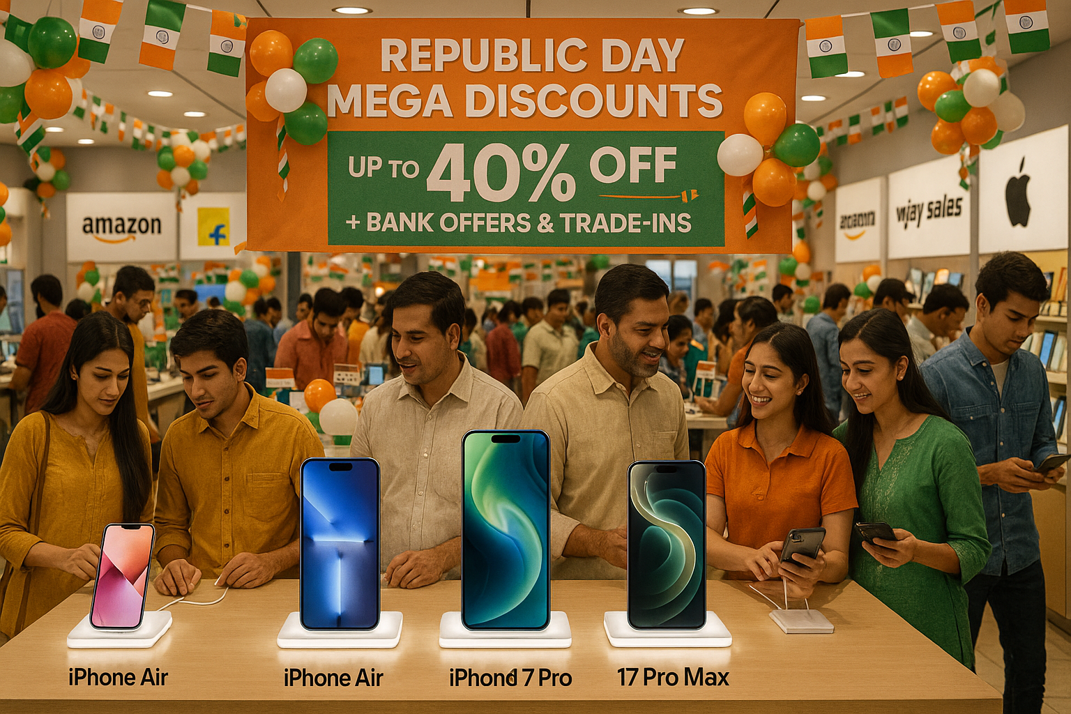 Busy Indian store with discounted iPhone 17 Pro models and Republic Day decorations during sales event.