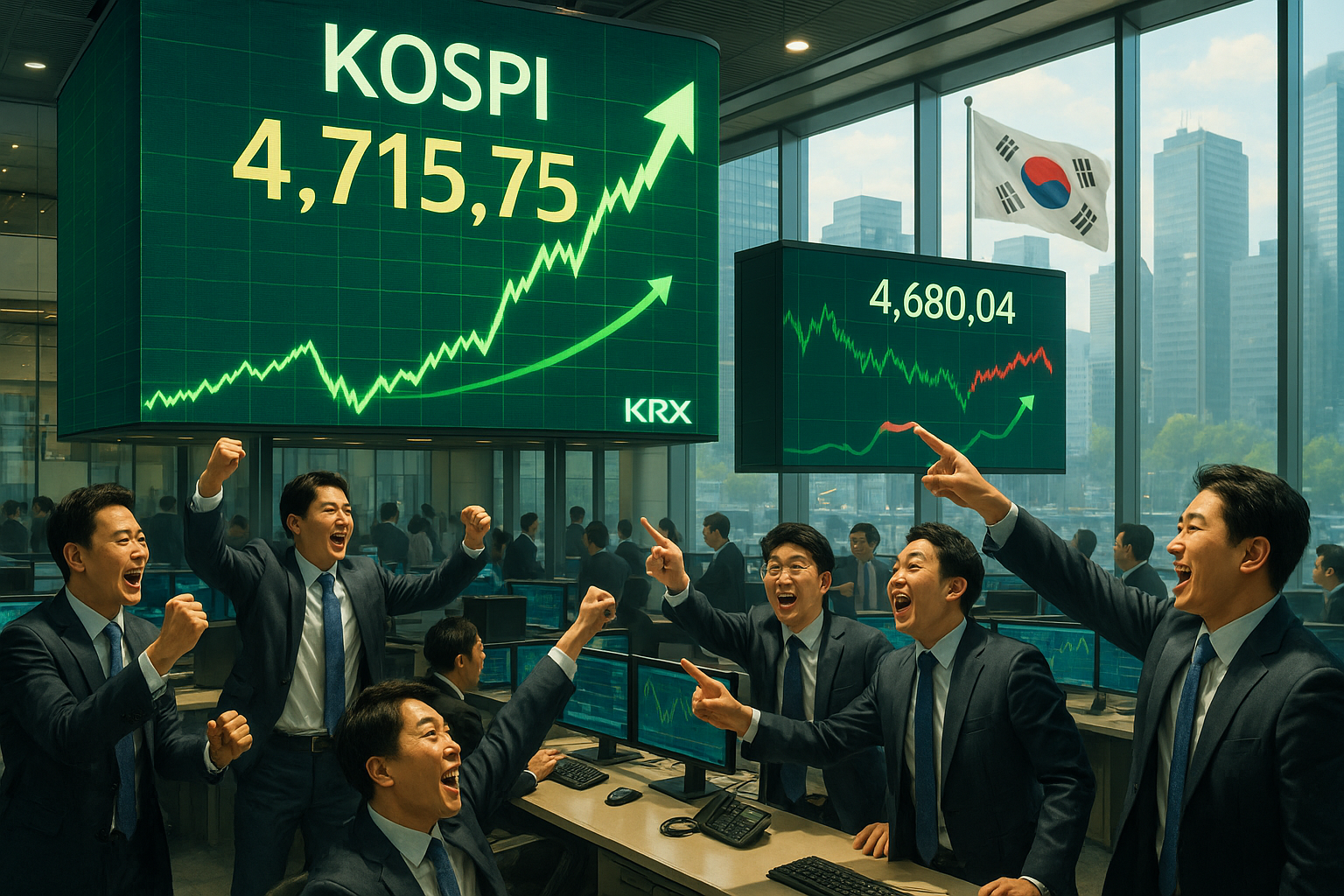 Trading floor scene showing KOSPI index peaking at 4,715 before dipping, amid South Korea's record bull run.