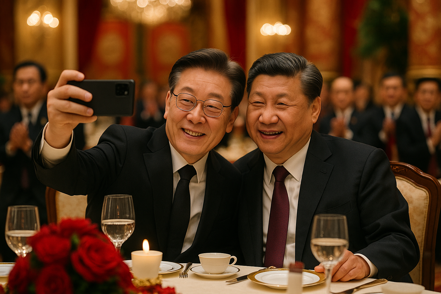 Viral selfie of South Korean President Lee Jae-myung and Chinese President Xi Jinping at Beijing summit state dinner, taken with Xiaomi smartphone.