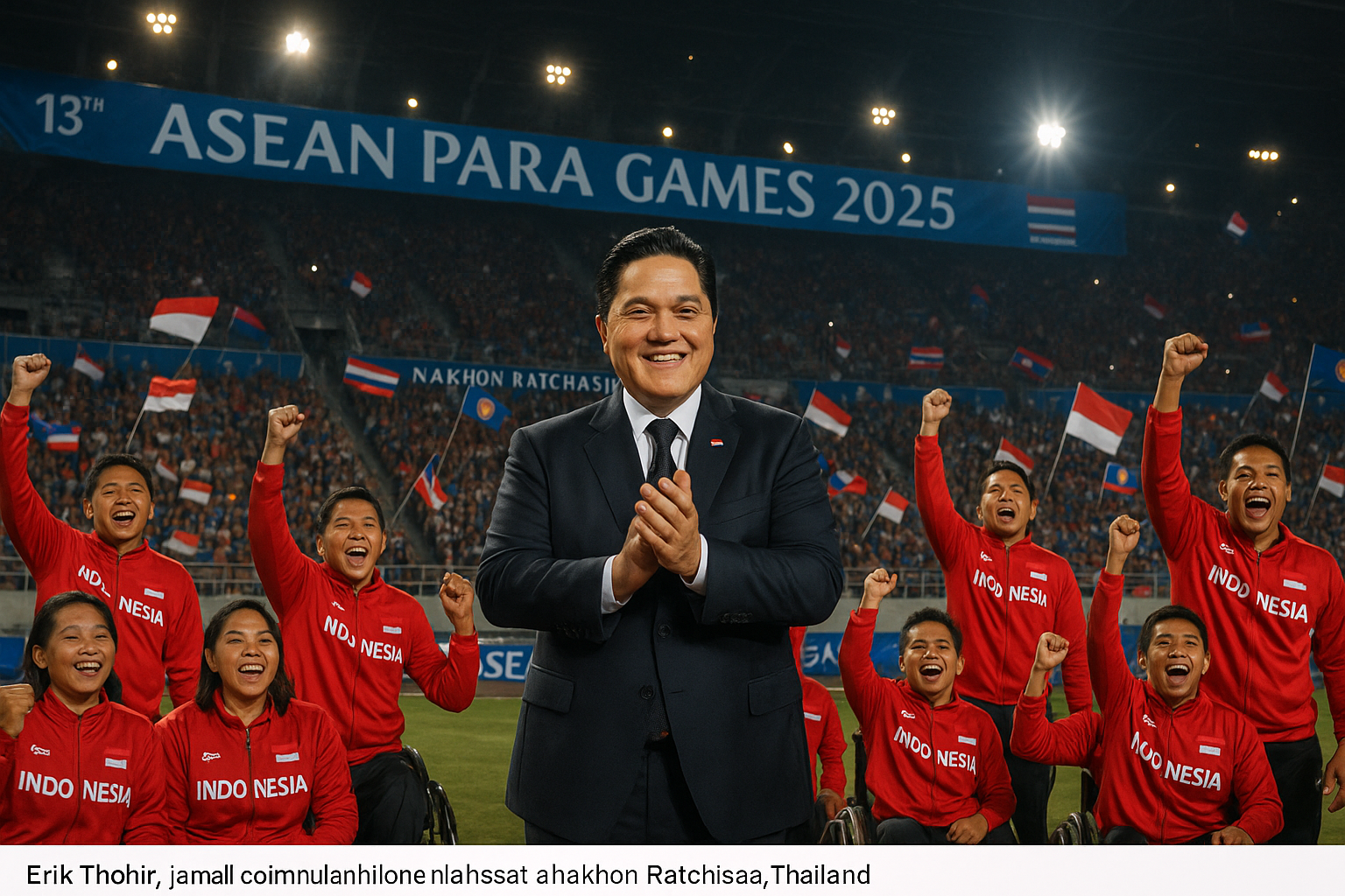 Indonesian Minister Erick Thohir at the ASEAN Para Games 2025 opening ceremony with cheering para athletes and flag-waving crowd.