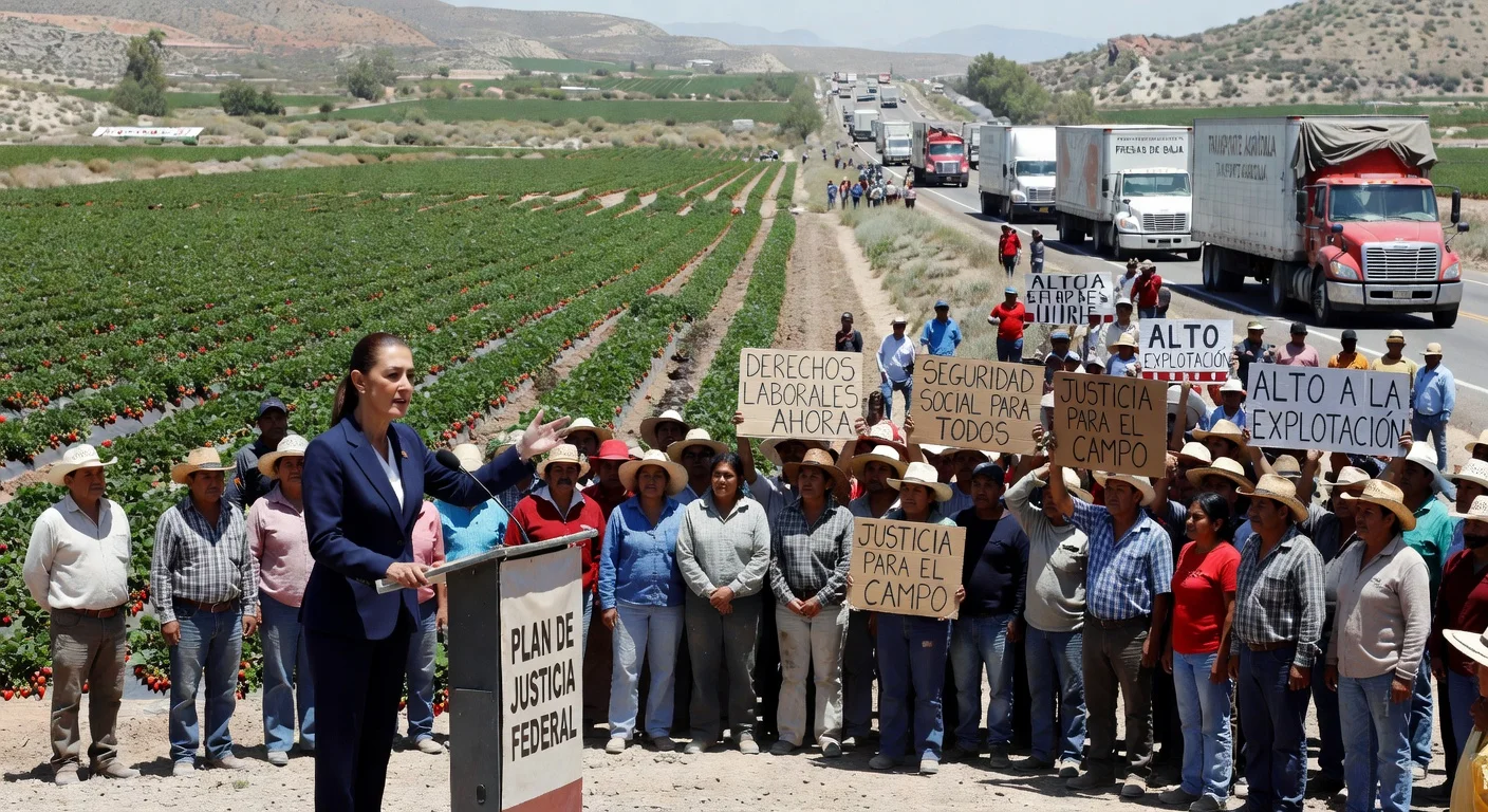 President Sheinbaum addresses San Quintín farmworkers, unveiling Justice Plan amid berry fields and highway.