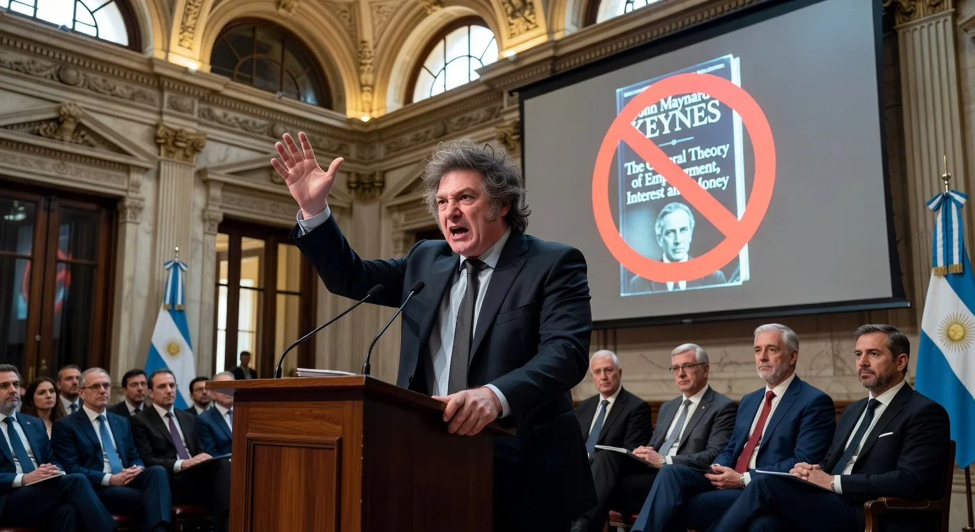 Argentine President Javier Milei speaks critically on Keynes' economics at Palacio Libertad event with economists de Pablo and Ravier.