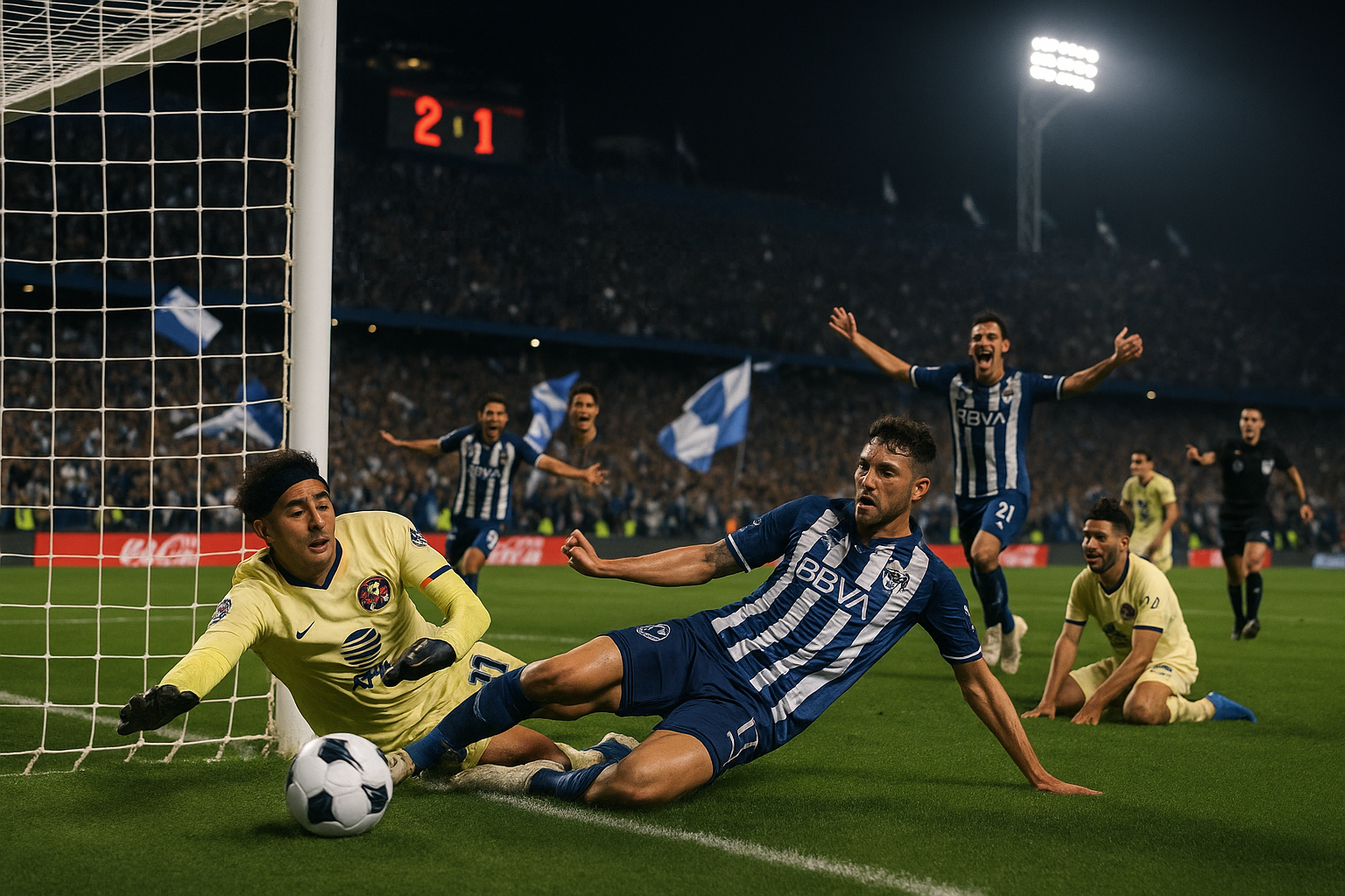Rayados de Monterrey's Germán Berterame scores the decisive stoppage-time goal to eliminate América and advance to Liga MX semifinals, celebrations erupt at Estadio Ciudad de los Deportes.