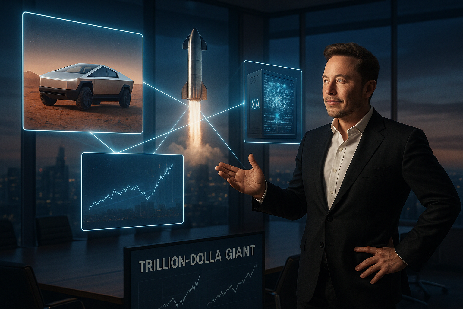 Illustration depicting Elon Musk envisioning the merger of Tesla, SpaceX, and xAI into a trillion-dollar tech empire amid speculation.