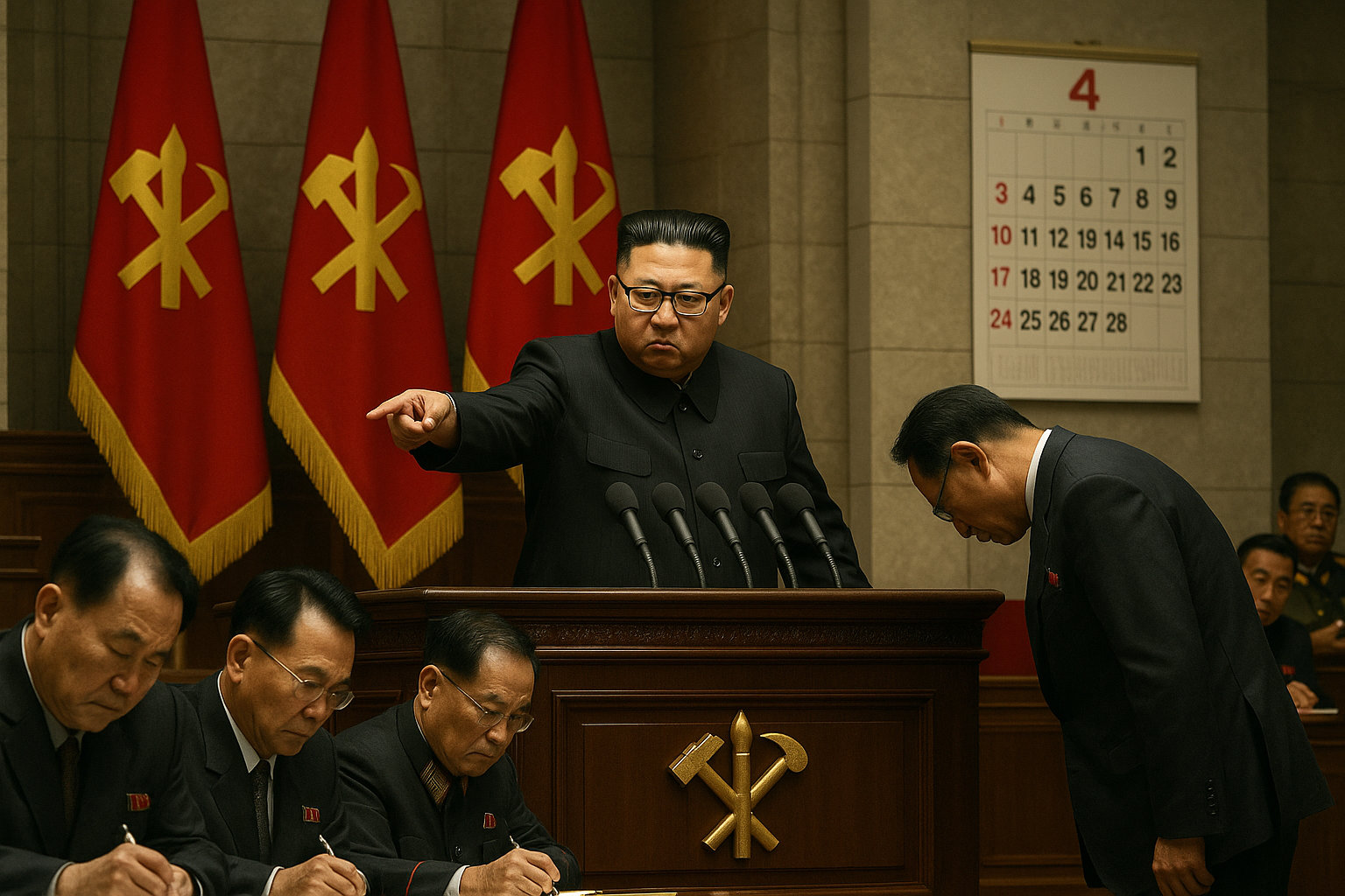 Illustration depicting Kim Jong-un dismissing a vice premier amid preparations for North Korea's party congress.