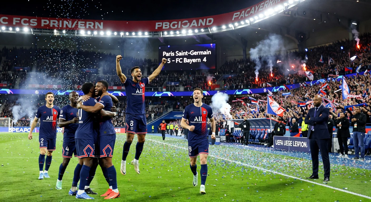 Paris Saint-Germain defeated FC Bayern München 5:4 in the Champions League semi-final first leg. The match at Paris's Parc des Princes featured nine goals, the most in any semi-final in the competition's history. Bayern coach Vincent Kompany watched from the stands due to a suspension.