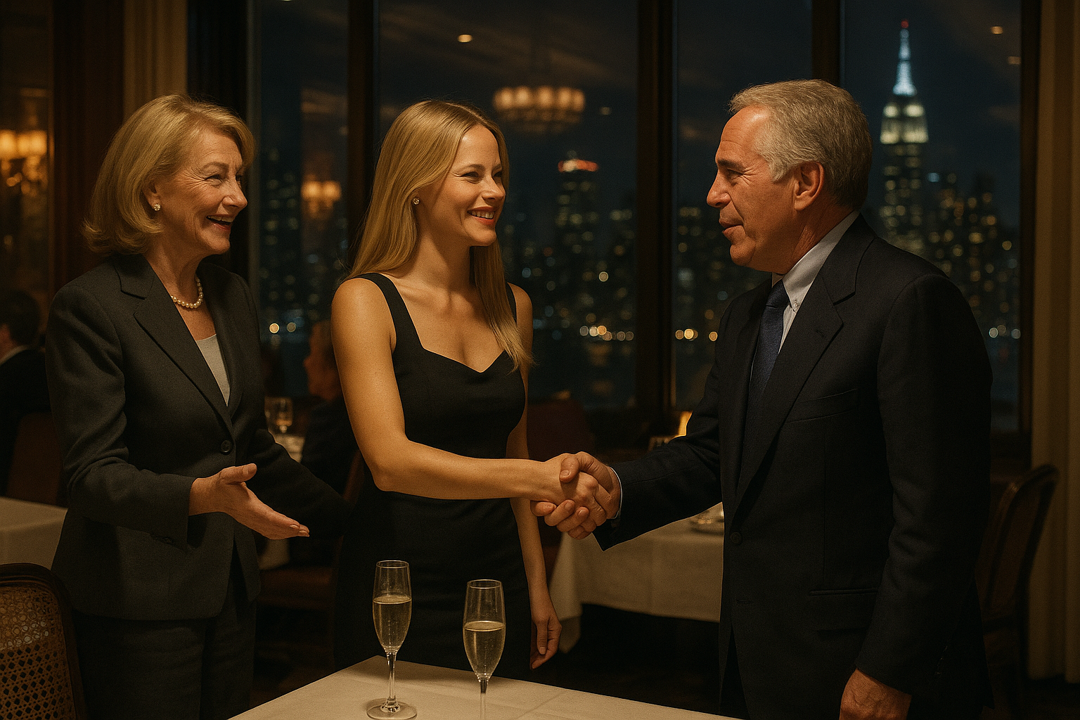 Illustration of Sofia Hellqvist meeting Jeffrey Epstein in 2005 New York, introduced by Barbro Ehnbom, for news article on their social contacts.