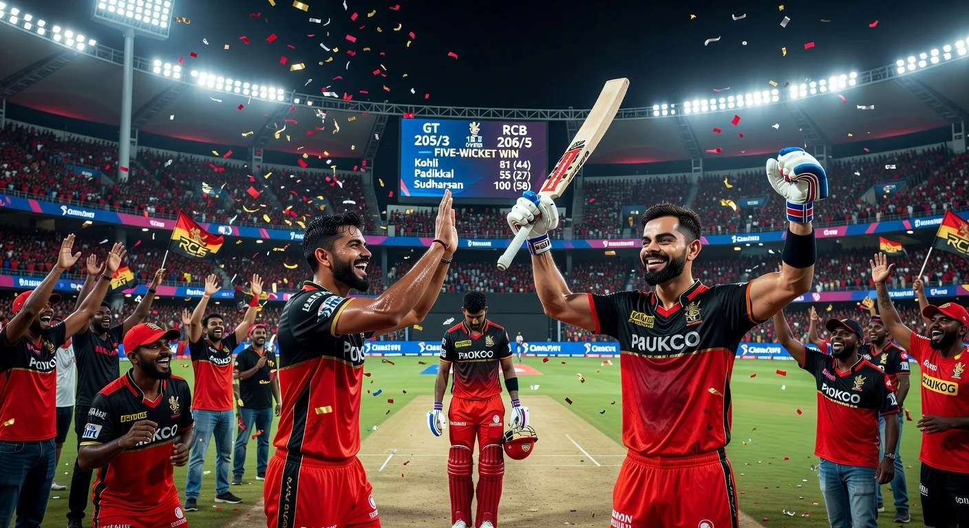 In IPL 2026’s 34th match at Bengaluru’s M Chinnaswamy Stadium, Gujarat Titans posted 205/3 powered by Sai Sudharsan’s 100 off 58 balls. Royal Challengers Bengaluru chased the target in 18.5 overs with Virat Kohli’s 81 off 44 balls and Devdutt Padikkal’s 55 off 27 balls to win by five wickets. Sudharsan also set a record for the fastest 2000 IPL runs during his innings.