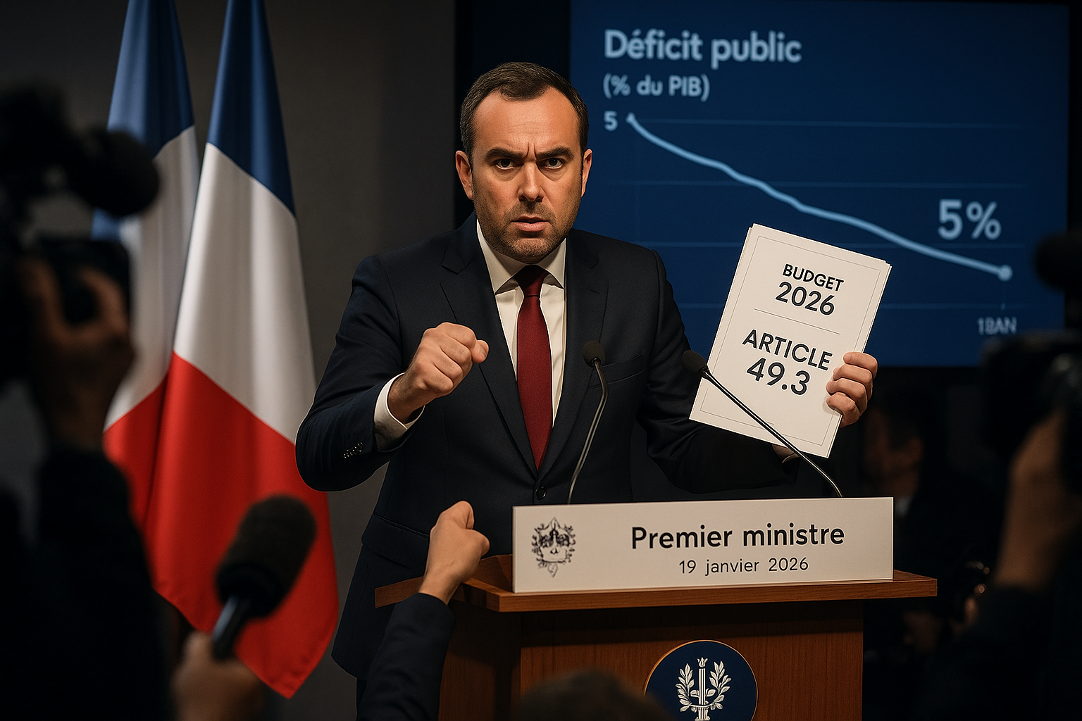 Prime Minister Sébastien Lecornu announced on Monday, January 19, 2026, after a Council of Ministers, that he would engage the government's responsibility on Tuesday via Article 49.3 of the Constitution to pass the revenues part of the 2026 budget, despite his initial promise not to use it. This decision, driven by parliamentary deadlock, aims to reduce the public deficit to 5% of GDP and includes concessions to the Socialist Party, such as maintaining a corporate surtax at 8 billion euros. La France Insoumise and the National Rally plan to file no-confidence motions.