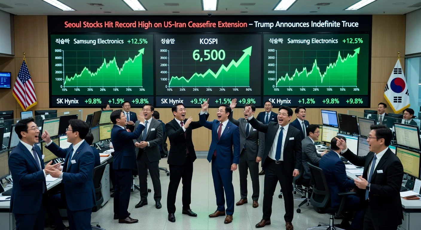 Seoul stocks surge at open ahead of US-Iran ceasefire deadline, traders celebrate KOSPI record rally.