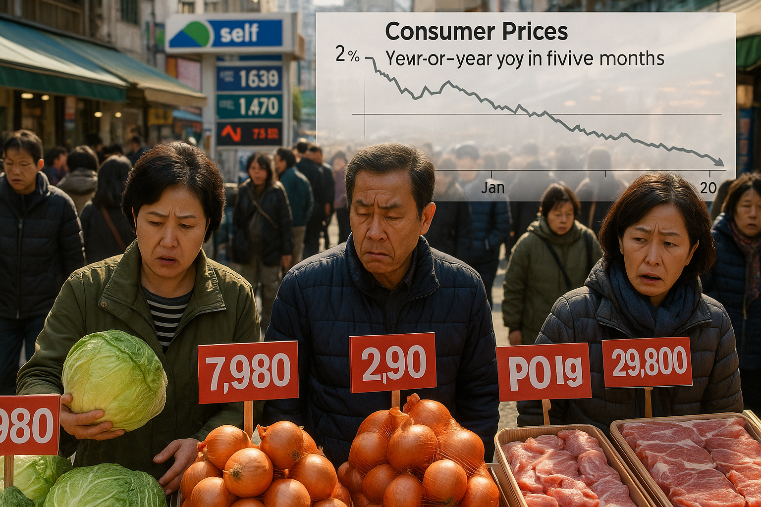South Korean market scene contrasting high food prices with stable fuel costs amid 2% inflation slowdown.