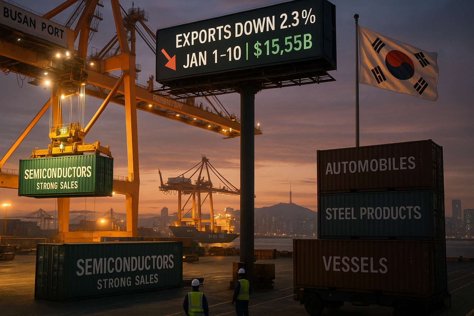 South Korea's exports fell 2.3 percent year-on-year in the first 10 days of January, despite robust semiconductor shipments. According to Korea Customs Service data, outbound shipments totaled $15.55 billion for the period. Weaker performance in automobiles, vessels, and steel products offset the gains.