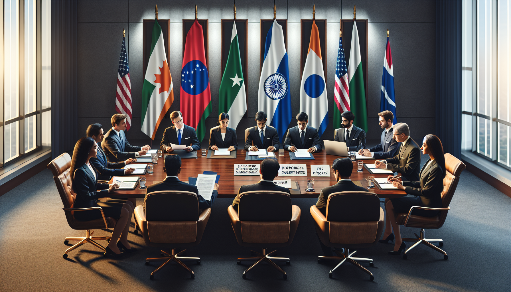 Diplomats from South Korea and the US revising summit fact sheet in a conference room, with national flags and documents on the table.