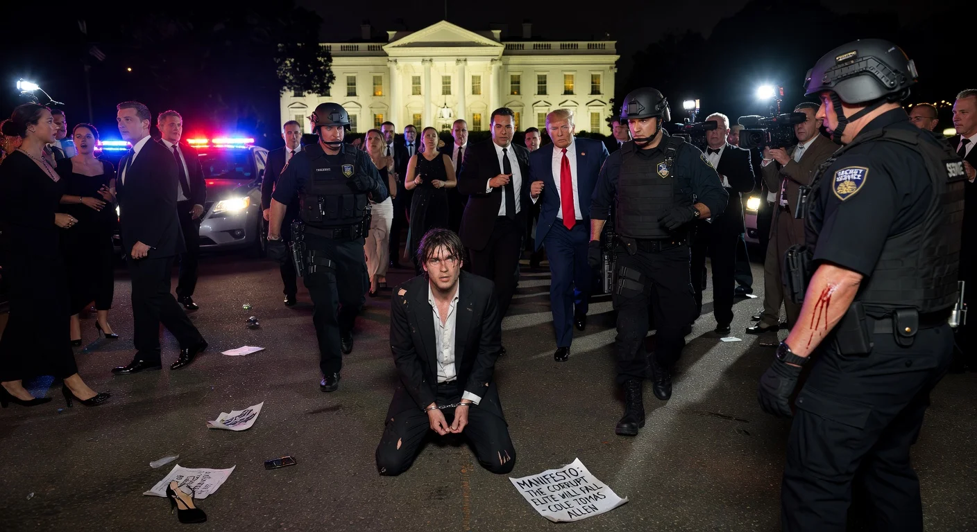 Illustration depicting the arrest of WHCD shooting suspect Cole Tomas Allen at the security checkpoint amid evacuations.