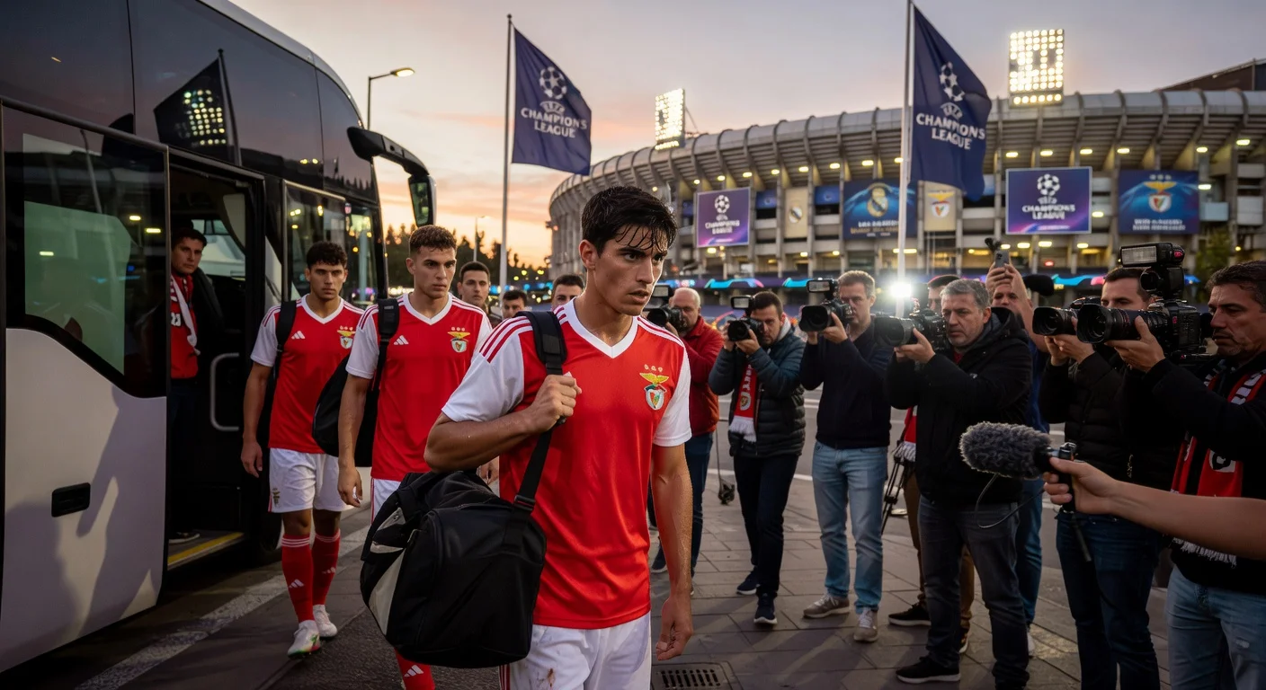 Gianluca Prestianni with Benfica squad arriving in Madrid for Champions League match against Real Madrid amid UEFA suspension controversy.