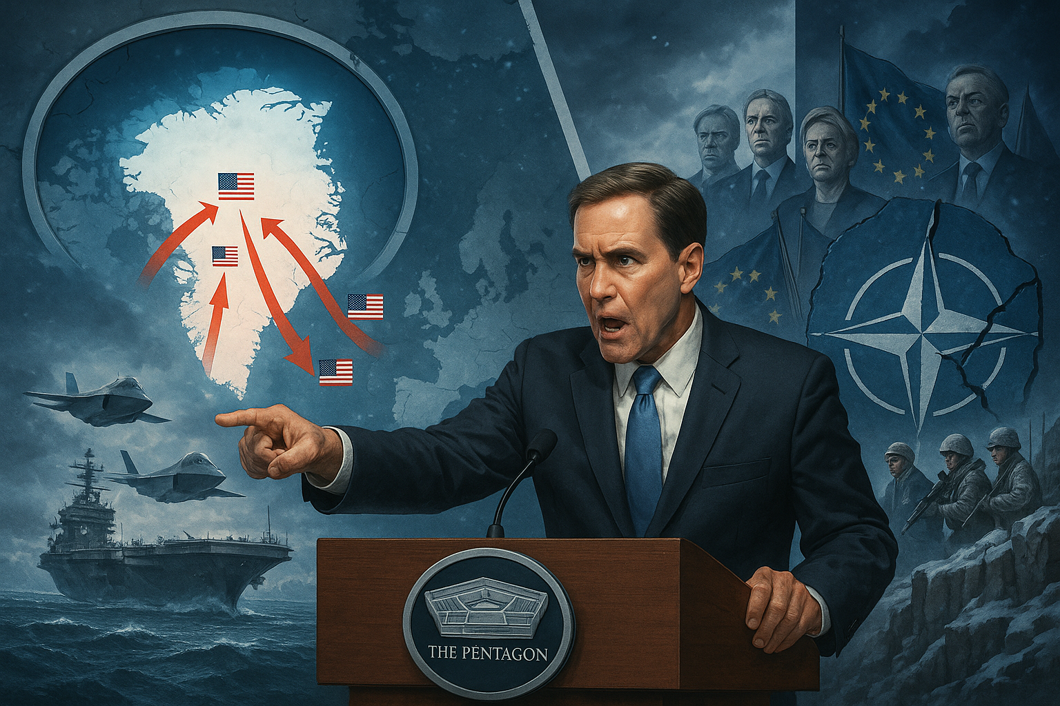 Dramatic illustration of US military rhetoric threatening Greenland, featuring maps, jets, and opposing European defenses in an Arctic standoff.