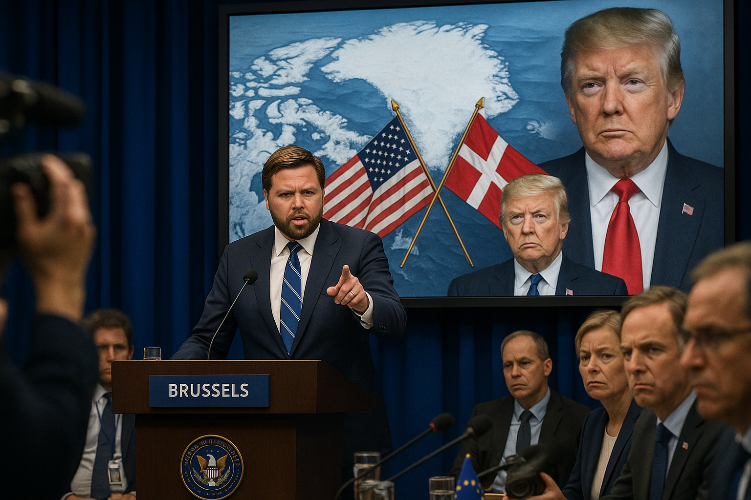 JD Vance warns European leaders at podium with Greenland map and Trump portrait in background.