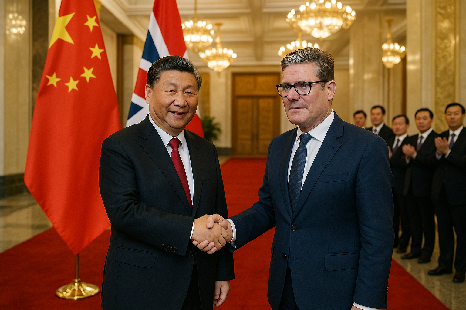 Xi Jinping shakes hands with Keir Starmer in Beijing's Great Hall of the People, marking renewed UK-China diplomatic ties.