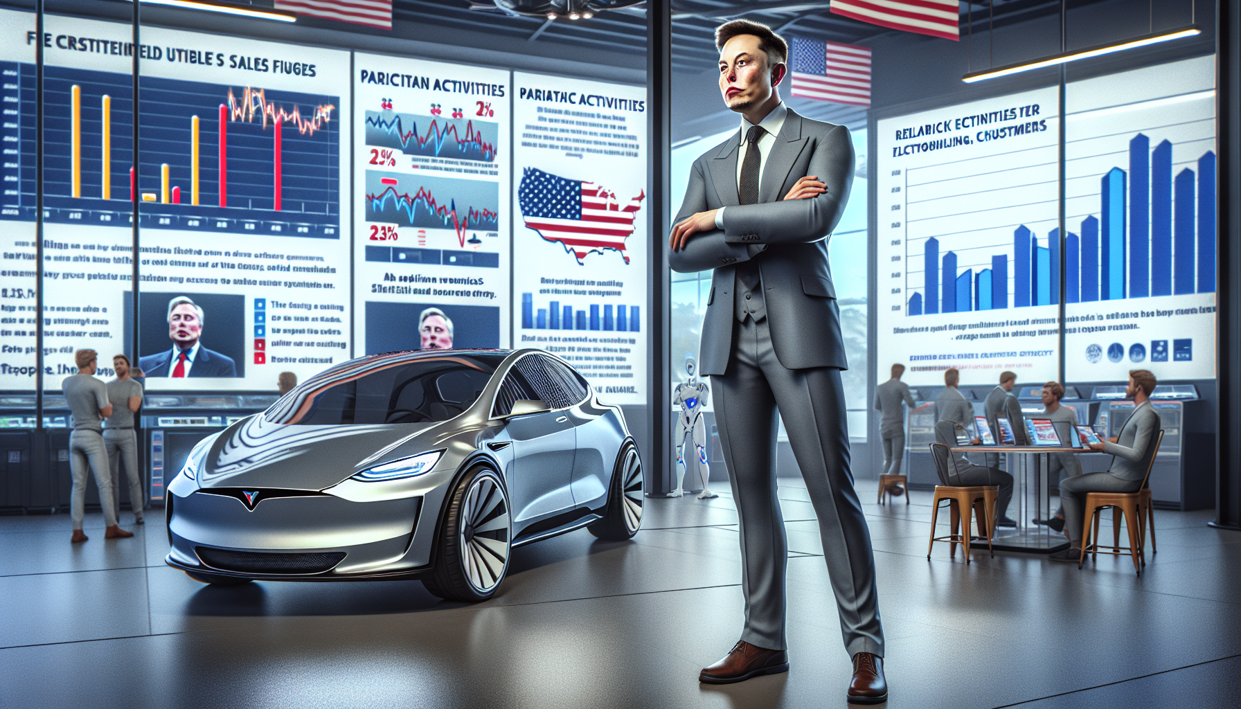 Elon Musk in a Tesla showroom with sales decline charts and political elements, illustrating the impact of his politics on vehicle sales according to a Yale study.
