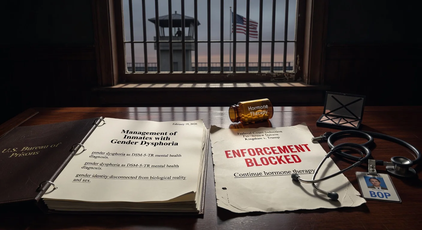 Los expedientes judiciales en el caso Kingdom también describen memorandos internos previos de la BOP emitidos en febrero de 2025. Una declaración presentada en el caso indica que un memorando del 21 de febrero de 2025 reconocía que la agencia había sido bloqueada temporalmente para eliminar la atención médica y de salud mental, pero ordenaba que ciertas adaptaciones, como pronombres de afirmación de género, ropa interior y algunos artículos personales comprados, debían detenerse.