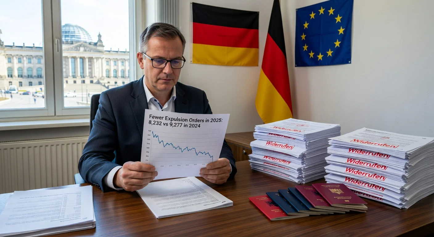 Realistic photo of German immigration office showing statistics on reduced 2025 expulsion orders affecting Georgians, Albanians, and Turks.