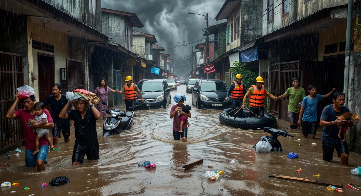 Las fuertes lluvias que azotan Yakarta y áreas circundantes desde la noche del sábado hasta la mañana del domingo, 8 de marzo de 2026, han causado inundaciones en 75 RTs y 19 calles en Yakarta Oeste, Sur y Este. Los niveles de agua alcanzaron hasta 1,7 metros en algunos puntos, obligando a los residentes a evacuar e interrumpiendo el acceso vial. La BPBD de DKI Yakarta ha desplegado personal para evacuaciones y mitigación de inundaciones.