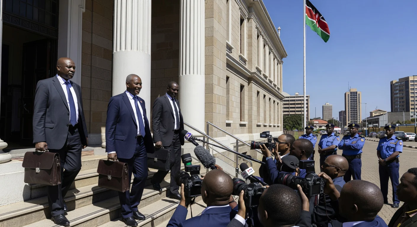 Raphael Tuju outside Kenya's High Court after receiving anticipatory bond in self-abduction probe, with lawyers and journalists.
