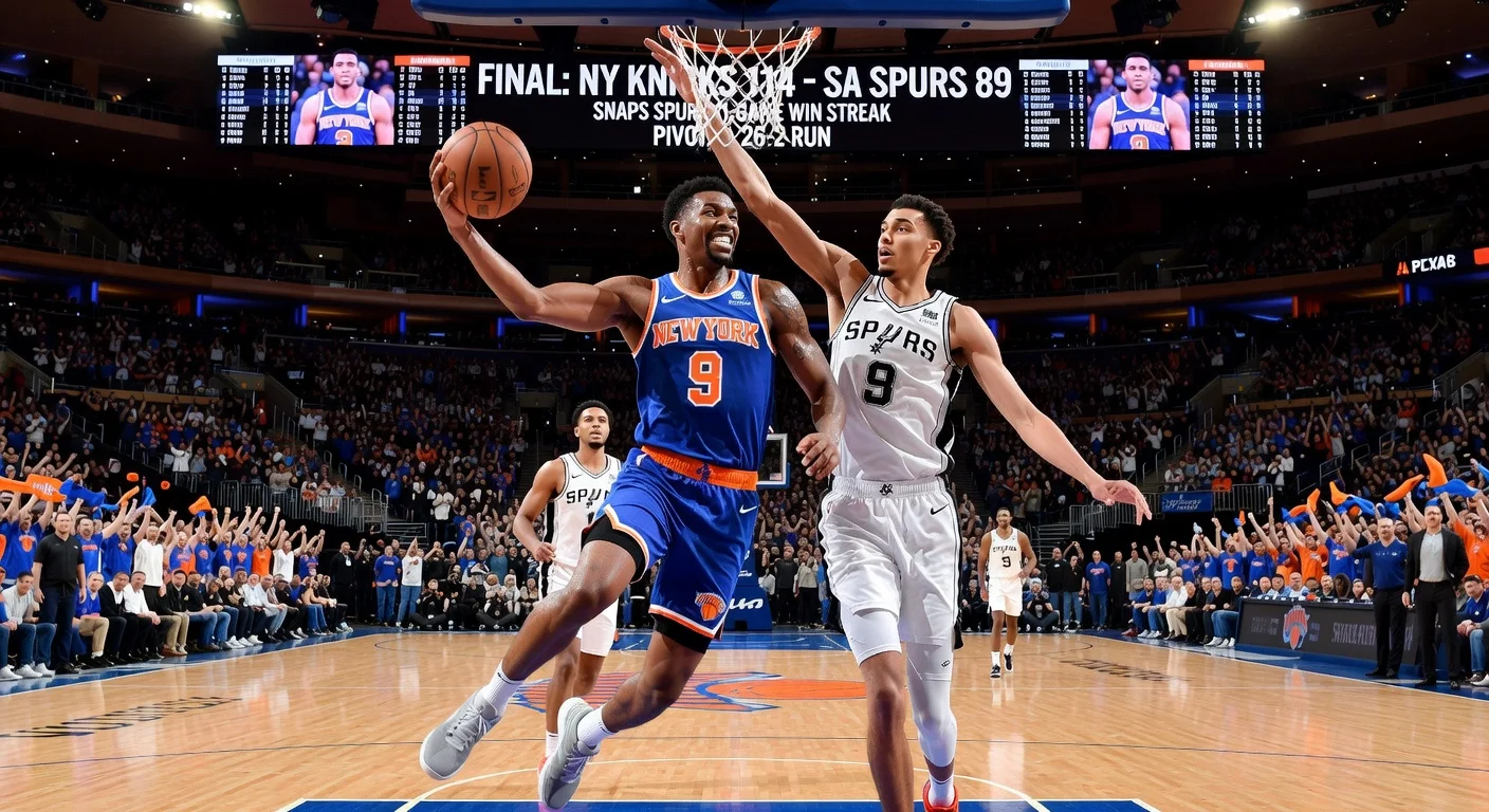 Los New York Knicks vencieron 114-89 a los San Antonio Spurs el domingo, rompiendo la racha de 11 victorias de los Spurs en el Madison Square Garden. Una decisiva racha de 26-2 de los Knicks en la primera mitad resultó pivotal tras un tempranero liderato de los Spurs. Mikal Bridges lideró a Nueva York con 25 puntos, mientras Victor Wembanyama anotó 25 para San Antonio.