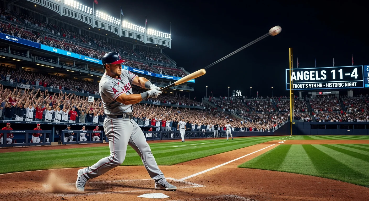 Los Angels derrotaron a los Yankees 11-4 el jueves por la tarde, dividiendo la serie de cuatro juegos. Trout bateó un jonrón solitario de 446 pies en la séptima entrada ante Angel Chivilli, su séptimo de la temporada. Terminó la serie con 6 imparables en 16 turnos, cinco jonrones y tres bases por bolas, mejorando su línea ofensiva a .246/.416/.594 desde el .208/.400/.377 con el que comenzó la semana. Trout acumula ahora 13 jonrones de por vida en 34 juegos en el Yankee Stadium y ha conectado cuadrangular en cinco juegos consecutivos allí, contando desde la temporada pasada, una hazaña compartida solo con Aaron Judge desde 2009 en el estadio actual. Siendo el primer jugador visitante en conectar jonrón en cuatro días consecutivos en ese parque, Trout comentó: 'Han pasado muchos grandes jugadores por aquí. Es increíble'. Atribuyó su buen contacto a su estado de salud y a un ajuste mecánico (un paso atrás antes de realizar el swing), logrando una velocidad de salida promedio de 93.5 mph y una tasa de barriles del 28.6% al inicio de esta temporada, muy por encima de los promedios de la liga. Las lesiones lo limitaron a 396 de 810 partidos entre 2021 y 2025, pero este año regresó al jardín central. El mánager de los Angels, Kurt Suzuki, lo calificó como 'una semana increíble' y elogió la presencia de Trout en el vestuario. El toletero de los Yankees, Giancarlo Stanton, reconoció: 'Es irreal. Fue genial ver lo que hicieron él y Judgie durante toda la serie... hay que reconocer la grandeza'. Aaron Judge y Stanton conectaron jonrones juntos por 61.ª vez, pero los Yankees perdieron a pesar de que el octavo jonrón de Judge empató el liderato de las Grandes Ligas. Oswald Peraza, ex prospecto de los Yankees, bateó de 10-5 con dos jonrones y cuatro carreras impulsadas contra su antiguo equipo. El mánager de los Yankees, Aaron Boone, fue expulsado tras una marcación de balk contra Ryan Yarbrough, quien otorgó una base intencional a Trout antes del grand slam de Jo Adell. Los Angels mejoraron su récord a 10-10, y Boone señaló problemas en el bullpen: 'La historia de la serie fue que simplemente no pudimos mantener la pelota dentro del estadio'.
