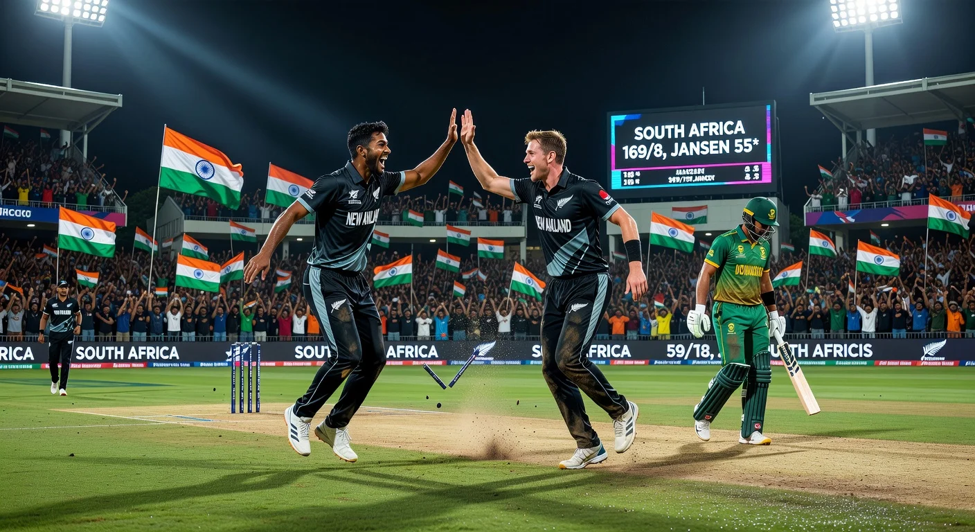 Nueva Zelanda ganó el sorteo y eligió bolear primero contra la invicta Sudáfrica en la primera semifinal de la Copa del Mundo T20 Masculina 2026 en Eden Gardens, en Calcuta. Cole McConchie y Rachin Ravindra tomaron wickets clave para limitar a Sudáfrica a 169 por ocho, con Marco Jansen invicto con 55. Los Black Caps ahora necesitan 170 para llegar a la final en Ahmedabad.