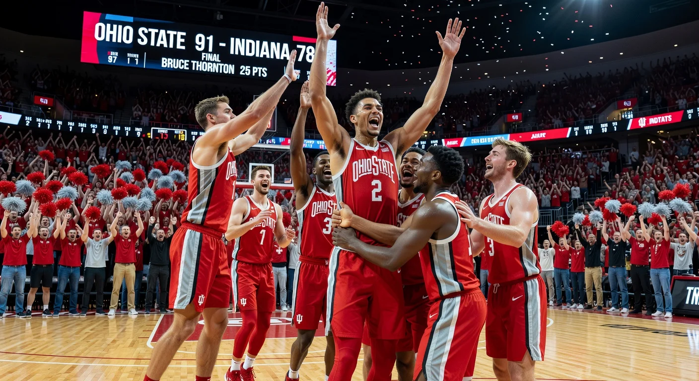 El partido comenzó a las 5:30 p. m. ET con Indiana tomando una ventaja de 5-0, pero Ohio State respondió rápidamente con una racha de 6-0 culminada con un mate de Amare Bynum para tomar la delantera. A mitad del primer tiempo, Indiana realizó una racha de 8-0 para reducir el déficit a tres puntos (28-25), pero Ohio State superó a los Hoosiers 22-8 en los siguientes 7,5 minutos, tirando 9 de 11 desde el campo y 4 de 5 desde más allá del arco para liderar 50-33 al descanso. nnOhio State tiró un 67,9% desde el campo y 8 de 13 desde más allá del arco en el primer tiempo, terminando el partido con un 59,2% general y 11 de 24 en triples. Thornton selló su momento récord con un triple a finales del primer tiempo, superando la marca de Hopson y recibiendo una ovación de pie del público completo de 18.809 en el Schottenstein Center. Terminó con 25 puntos en 7 de 9 tiros, siete asistencias y tres rebotes. nnIndiana tuvo problemas defensivos, permitiendo a Ohio State promediar 1,422 puntos por posesión. Los Hoosiers tiraron solo 1 de 8 en triples en el primer tiempo y cometieron ocho pérdidas que llevaron a 13 puntos de los Buckeyes. En la segunda mitad, Indiana mejoró al 65,2% desde el suelo y 4 de 10 desde el perímetro, reduciendo la ventaja a 10 puntos con tres minutos restantes gracias a una racha de 9-2. Sin embargo, el triple y uno de Devin Royal amplió la diferencia a 14, sellando la victoria. nnLamar Wilkerson lideró a Indiana con 18 puntos, seguido de Tucker DeVries con 17, Sam Alexis con 14, Conor Enright con 12 y Reed Bailey con 12 puntos y cinco rebotes. Para Ohio State, Bynum añadió 18 puntos y nueve rebotes, John Mobley Jr. anotó 18 con tres triples, y Taison Chatman aportó 11 puntos desde el banquillo. nnEl entrenador de Indiana, Darian DeVries, dijo después del partido: «No pudimos detenerlos al final de ese primer tiempo... la ventaja explotó». Reed Bailey añadió: «Estábamos justo donde queríamos estar... solo tenemos que encontrar algo para cavar más profundo». El entrenador de Ohio State, Jake Diebler, elogió a Thornton: «Ha abrazado el momento... enfocado en ganar». Thornton reflexionó: «Esta noche fue como debe ser el baloncesto de Ohio State. Soy un Buckeye de por vida». nnCon la victoria, Ohio State (20-11, 12-8 Big Ten) obtiene un doble bye y será la semilla No. 7 u 8 en el torneo que comienza el jueves en Chicago. Indiana (18-13, 9-11) juega a las 5:30 p. m. del miércoles como la semilla No. 10, necesitando al menos dos victorias para fortalecer sus opciones en el Torneo de la NCAA después de perder cinco de sus últimos seis partidos.