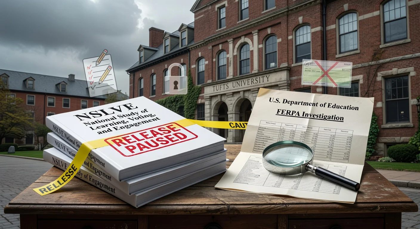 La Universidad Tufts ha pausado la publicación de sus informes del Estudio Nacional de Aprendizaje, Votación y Participación (NSLVE, por sus siglas en inglés), ampliamente utilizados, después de que el Departamento de Educación de los EE. UU. abriera una investigación sobre si las prácticas de coincidencia de datos del proyecto infringen la ley federal de privacidad estudiantil. El departamento también ha advertido a las universidades participantes que el uso de los nuevos datos del NSLVE podría poner en riesgo sus fondos federales.