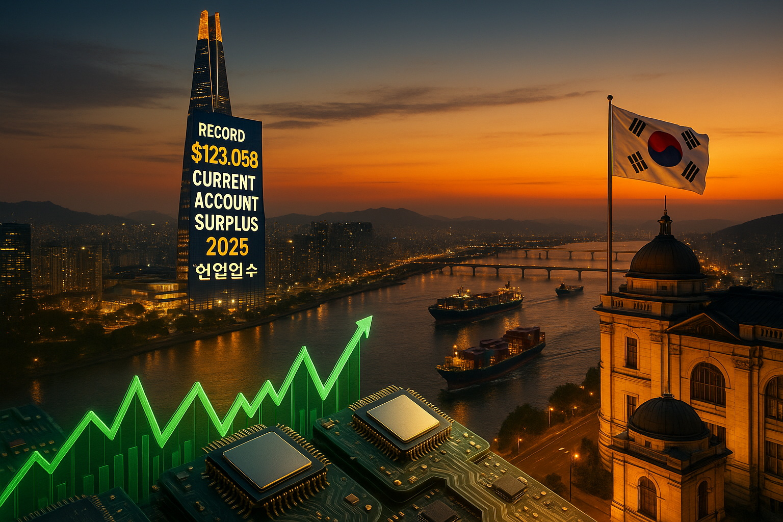 Illustration depicting South Korea's record $123.05 billion current account surplus in 2025, with Seoul landmarks, rising financial charts, semiconductors, and export ships.