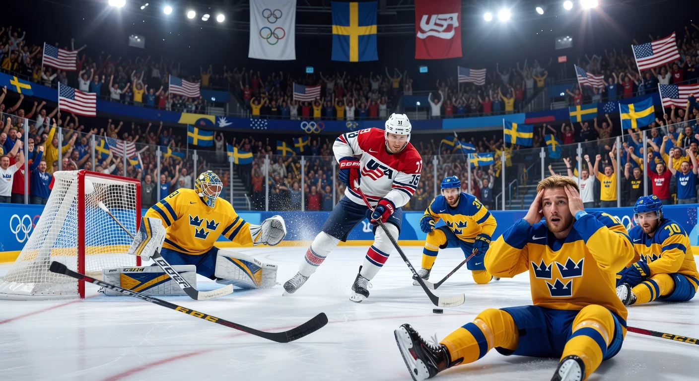 Ruotsin miesten jääkiekkomaajoukkue Tre Kronor karsiutui olympiaturnauksesta dramaattisen puolivälierätappion jälkeen USA:lle, 1–2 jatkoajalla. Quinn Hughes teki voittomaalin 3,27 minuutin kohdalla 3 vastaan 3 -jatkoajalla. Kapteeni Gabriel Landeskog kritisoi epätavallista formaattia ”pelottavaksi” olympiafinaaliin.