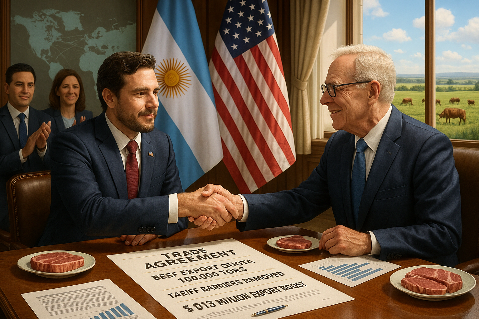 Argentine and US officials shake hands sealing trade deal expanding beef exports to 100,000 tons.