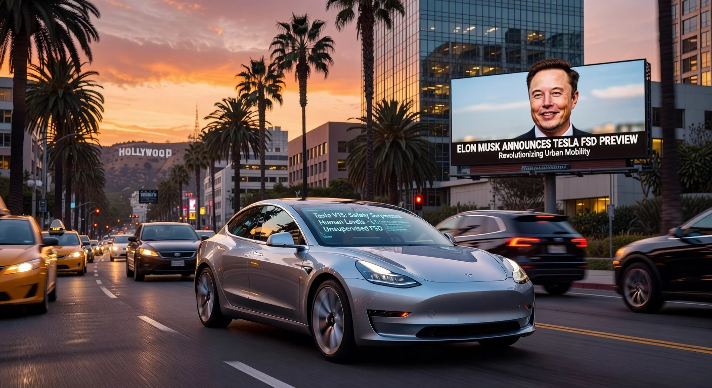 Tesla autonomous vehicle driving safely through Los Angeles, previewing V15 self-driving tech surpassing human safety.