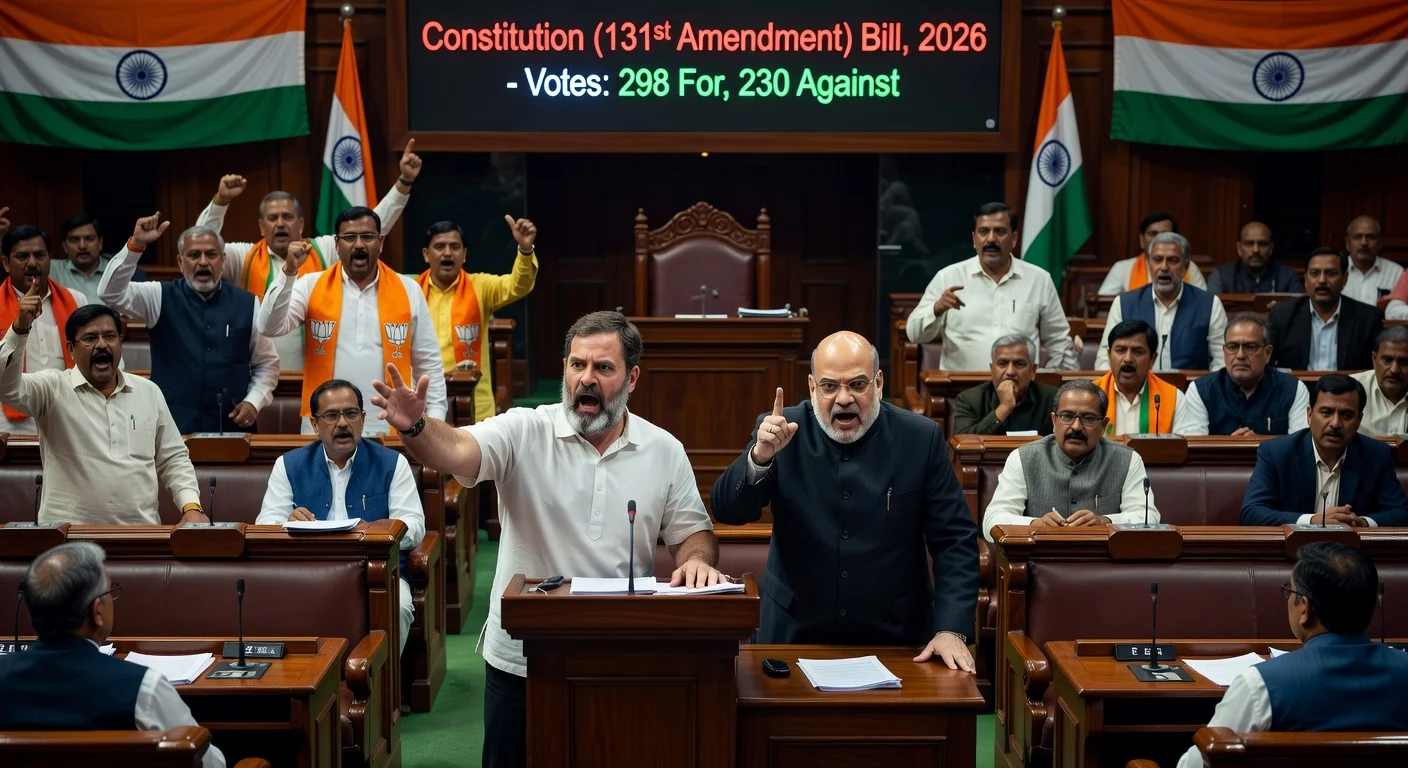 In the ongoing special parliamentary session, the Constitution (131st Amendment) Bill, 2026—for one-third women's reservation tied to delimitation—failed in Lok Sabha on Friday with 298 votes in favour and 230 against, missing the required two-thirds majority of 352 out of 528. This follows the bills' contentious introduction the previous day. Opposition leader Rahul Gandhi branded it a 'shameful law,' drawing a sharp rebuke from Home Minister Amit Shah, as BJP vowed nationwide protests.