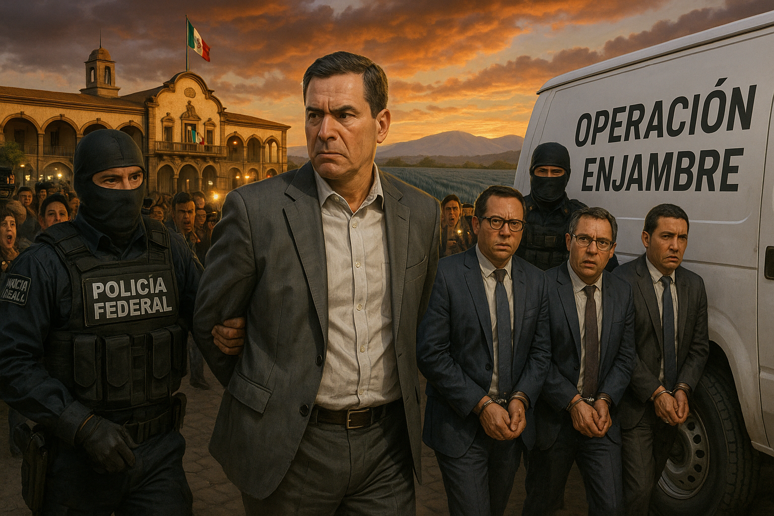 On February 5, 2026, around 3:30 a.m., federal forces launched Operation Enjambre in Tequila, Jalisco, arresting Morena-affiliated mayor Diego Rivera Navarro, accused of heading a corruption network extorting tequila and brewery firms, including a December 2025 attempt to charge José Cuervo 60 million pesos, leading to an extortion complaint. Alongside him, authorities detained Juan Manuel Pérez Sosa, public security director; Juan Gabriel Toribio Villarreal, from cadastre and property; and Isaac Carbajal Villaseñor, public works director. Coordinated by the Secretariat of Security and Citizen Protection (SSPC) under Omar García Harfuch, probes examine ties to a CJNG cell, plus embezzlement, threats, and gender-based political violence against councilwomen, as disclosed by Jalisco's prosecutor, Salvador González.