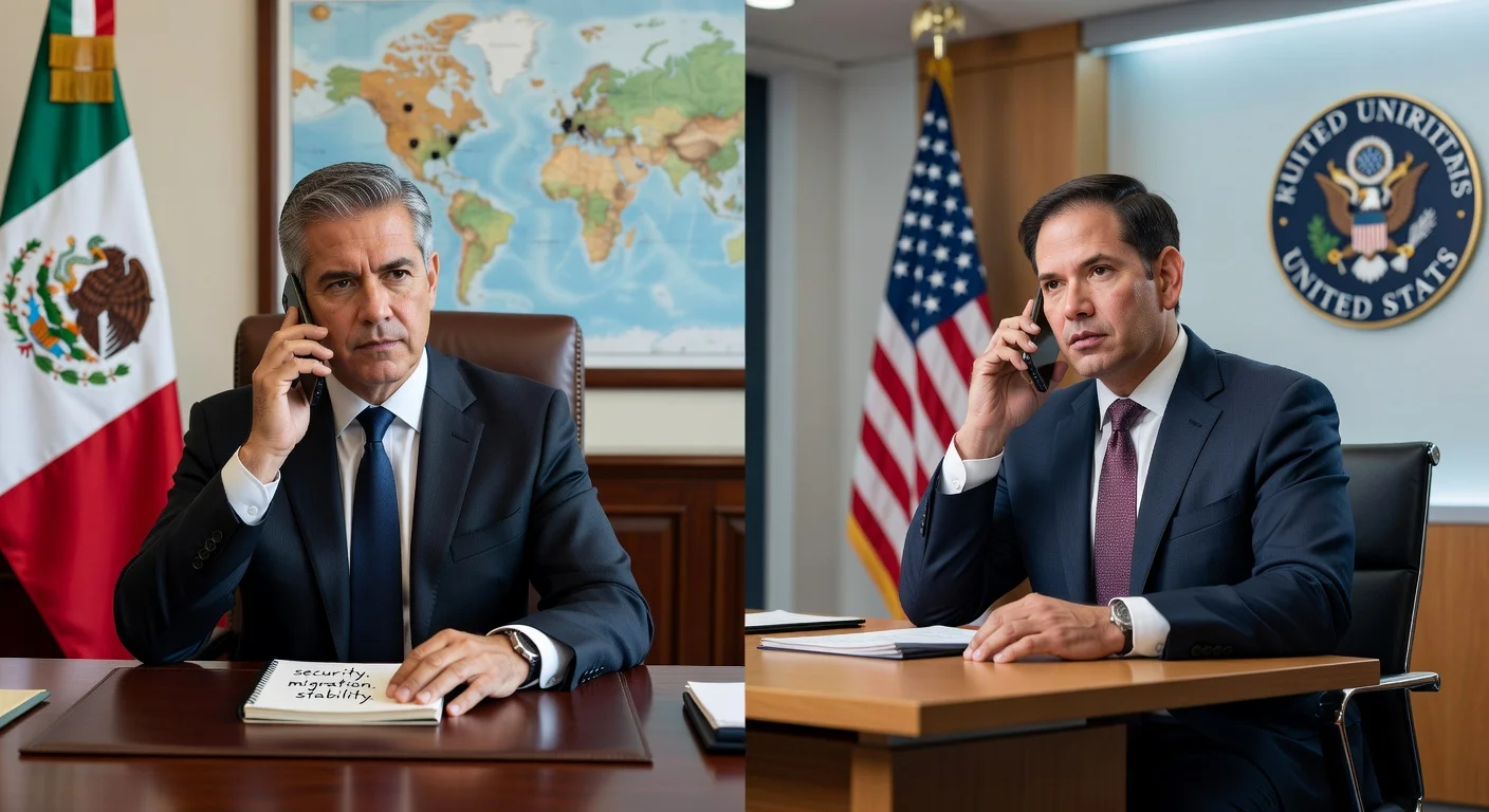 Split-image illustration of Mexico's Foreign Secretary Roberto Velasco and US Secretary of State Marco Rubio on their first phone call, discussing security, migration, and regional issues.
