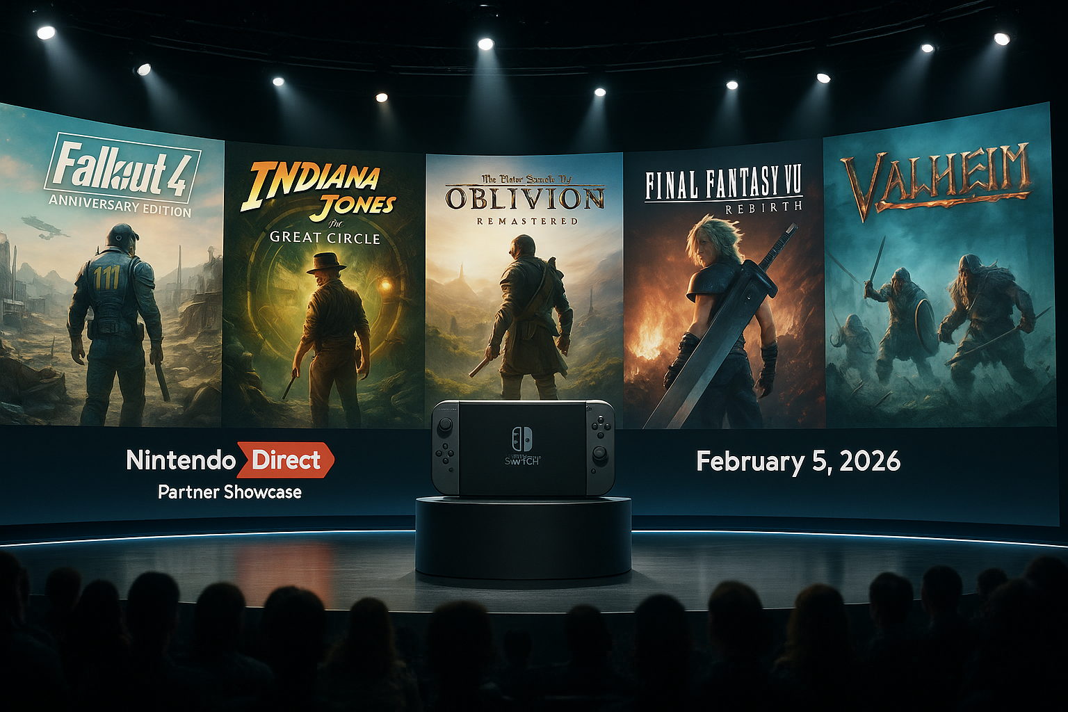 Realistic illustration of Nintendo Switch 2 Partner Showcase announcing Bethesda titles like Fallout 4 Anniversary Edition, Indiana Jones and the Great Circle, Oblivion Remastered, plus Final Fantasy 7 Rebirth and Valheim.